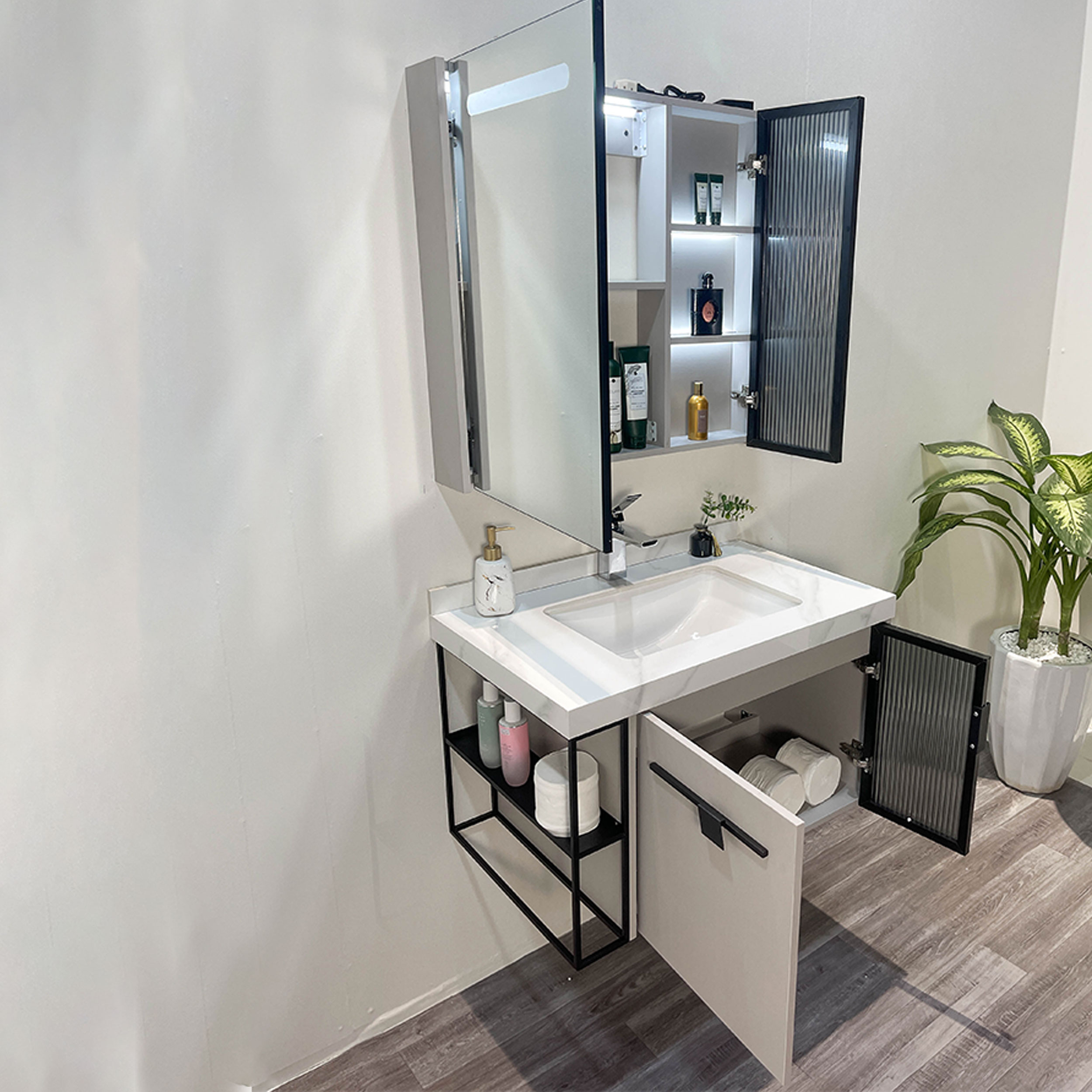– Tủ gương LED thông minh, cảm biến tự động bật tắt khi có người, chất liệu gương Phôi Bỉ chống ẩm mốc.